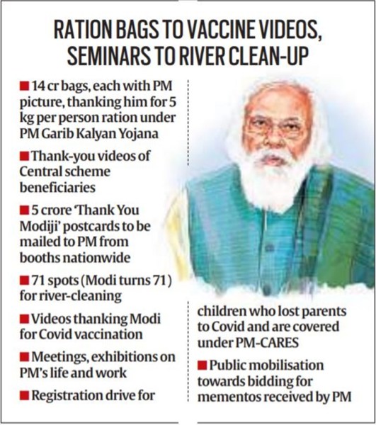 Since the 2014 Lok Sabha elections, Modi has been the pivot — and face — of almost all major BJP political campaigns. (File Photo)From 14 crore ration bags printed with his picture to 5 crore “Thank-you Modiji” postcards mailed from booths nationwide, identifying 71 spots for clean-up in rivers to a high-voltage social media campaign showcasing vaccination videos and seminars on his life and work: these are among the key elements of a three-week-long campaign the BJP will roll out to showcase Prime Minister Narendra Modi.
