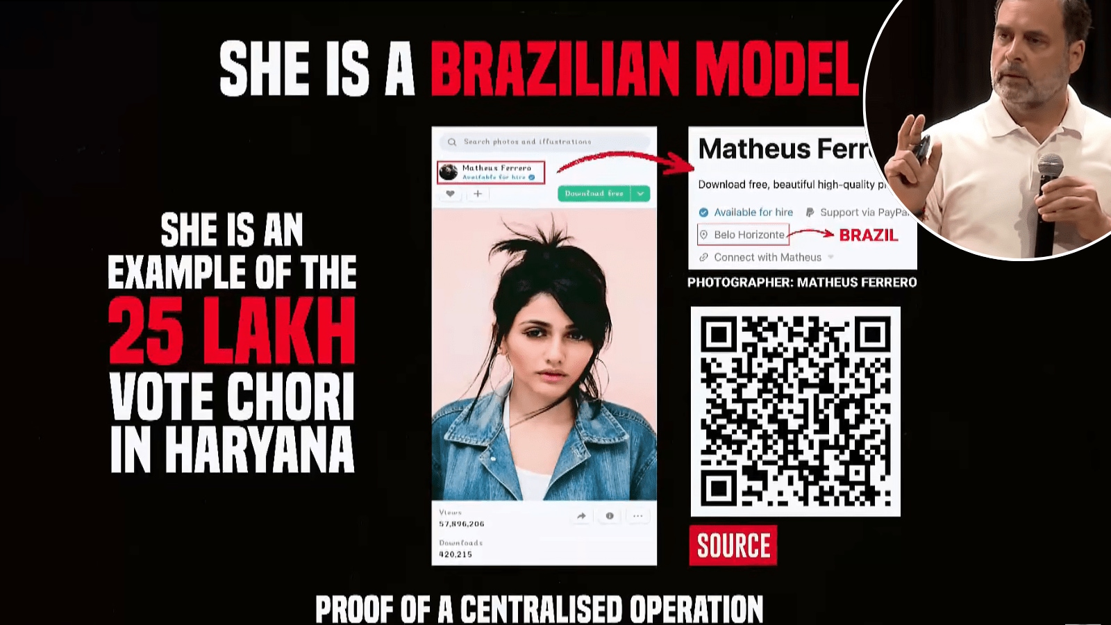 Rahul Gandhi put up pictures of voter rolls, which displayed a same photo of a Brazilian model photographed by Matheus Ferrero. The image was from the photo repository website Unsplash which showed the model on Ferrero’s profile.
