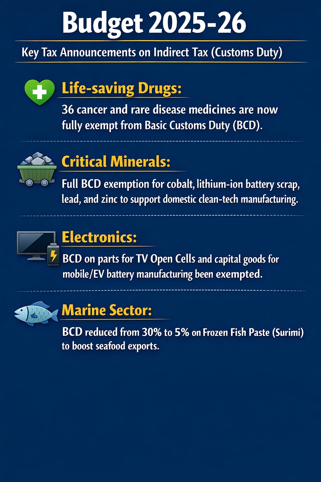 The Union Budget 2026–27 introduces key indirect tax reforms focused on boosting manufacturing, exports, and trade facilitation through customs and excise duty measures.