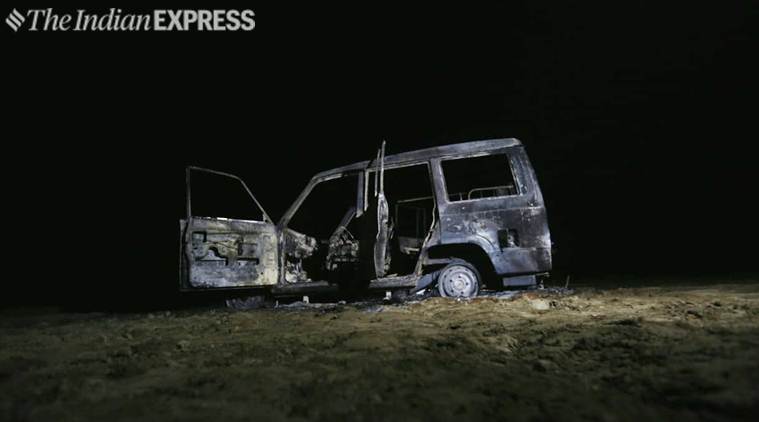 The charred remains of SHO Subodh Kumar Singh’s vehicle, set on fire by a mob in Bulandshahr on Monday (Express Photo)