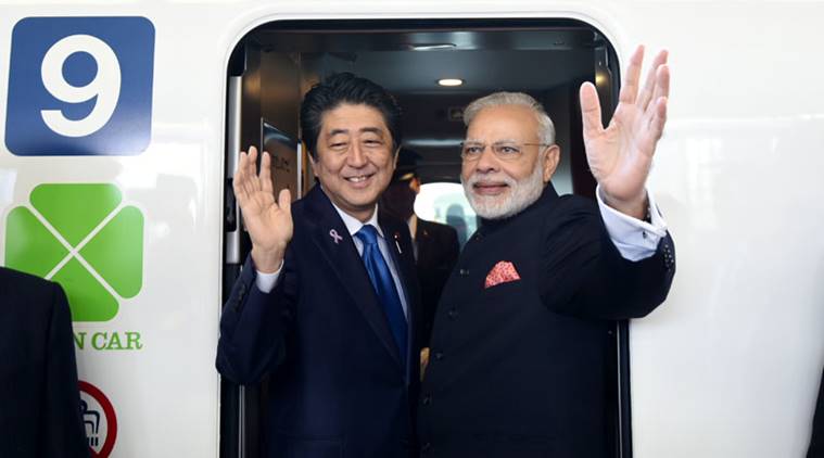 PM Modi and Japanese PM Shinzo Abe shake hands in front of the Japanese E5 Series Shinkansen Bullet Train in Japan.