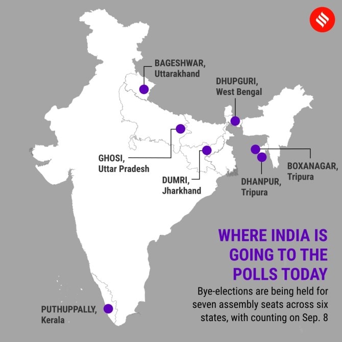 The bypolls at Dumri in Jharkhand, Puthuppally in Kerala, Boxanagar and Dhanpur in Tripura, Bageshwar in Uttarakhand, Ghosi in Uttar Pradesh, and Dhupguri in West Bengal began at 7 am. The counting of votes will take place on September 8. In five seats, by-elections were necessitated by the deaths of the sitting MLAs, while the two other MLAs resigned from their post.