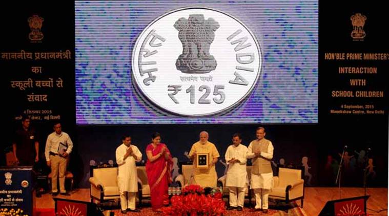 Narendra Modi also released a commemorative coin in the honour of Dr Sarvepalli Radhakrishnan. (Source: Express Photo by Ravi Kanojia)