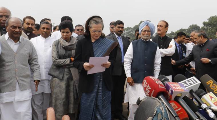 A delegation of senior Congress leaders led by party chief Sonia Gandhi, met President Ram Nath Kovind on Thursday seeking normalcy and peace in violence-hit Delhi. (Express Photo by Anil Sharma)
