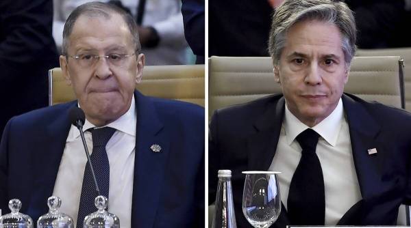This combination of photos shows US Secretary of State Antony Blinken, right, and Russian Foreign Minister Sergey Lavrov, left, attend the G20 foreign ministers’ meeting, respectively, in New Delhi, March 2, 2023. (AP)