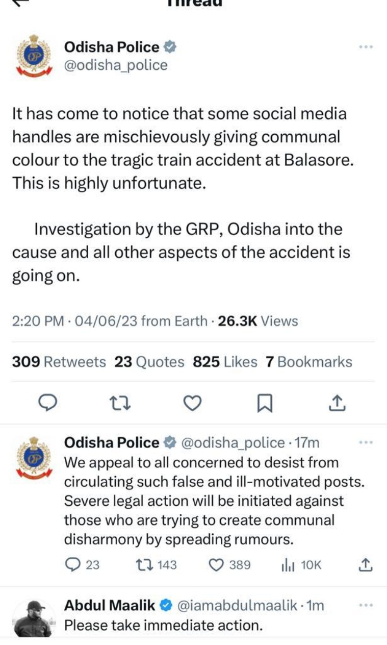 Odisha Police Sunday appealed to all sections to desist from circulating rumours giving a communal colour to Balasore’s triple train accident where at least 275 people have died and over 1,100 injured.