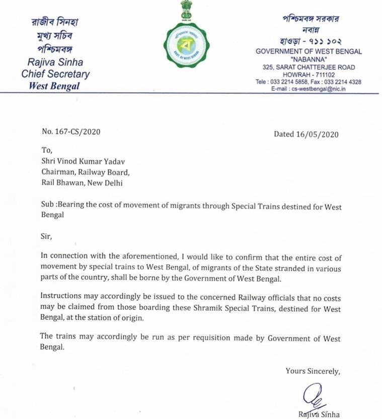 The Government of West Bengal has written to the Railway Board that it will bear all costs of movement for Bengal's migrant workers using special trains from other states to West Bengal. The government has said that it will not charge migrants.
