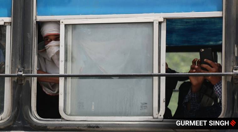 Migrants going back to their home town from the Shramik Special train brought to the railway station through buses in Ludhiana. (Express photo by Gurmeet Singh)