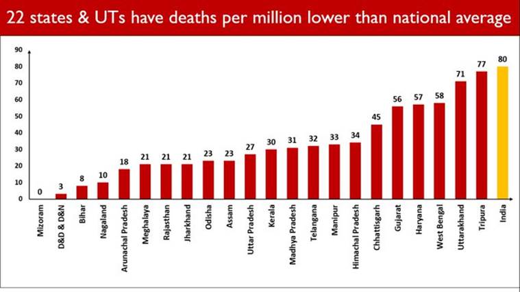 India continues to have one of the lowest deaths per million population globally (presently pegged at 80). Some states/UTs are performing better and reporting much lower deaths/million population than the national average: Ministry of Health