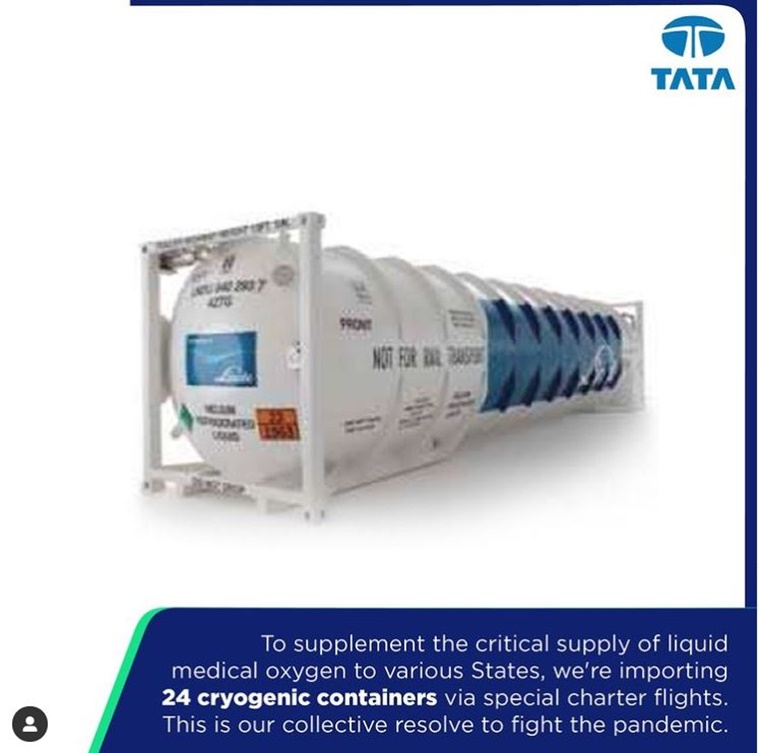 Tata companies, in its resolve to fight the pandemic, is importing 24 cryogenic containers via special charter flights to supplement the critical supply of liquid medical oxygen to various states.