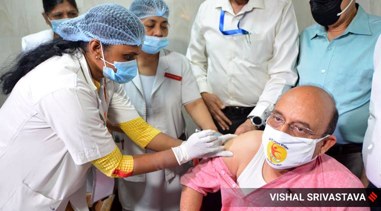 Uttar Pradesh Health Minister Jai Pratap Singh taking first dose of Covid-19 vaccine at civil hospital in Lucknow on Friday. (Express photo by Vishal Srivastav)