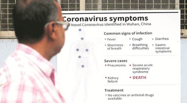 A man reads a poster carrying messages on symptoms of coronavirus in Kolkata on Thursday. The total number of cases detected across the country touched 30 on Thursday, including three in Kerala who were discharged last month. (Reuters)