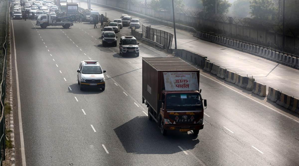 A truck with the first batch of Serum Institute of India’s Covishield vaccine passes through a green corridor on its way from IGI airport to Rajiv Gandhi Super Specialty Hospital in New Delhi Tuesday. (Express photo by Tashi Tobgyal)