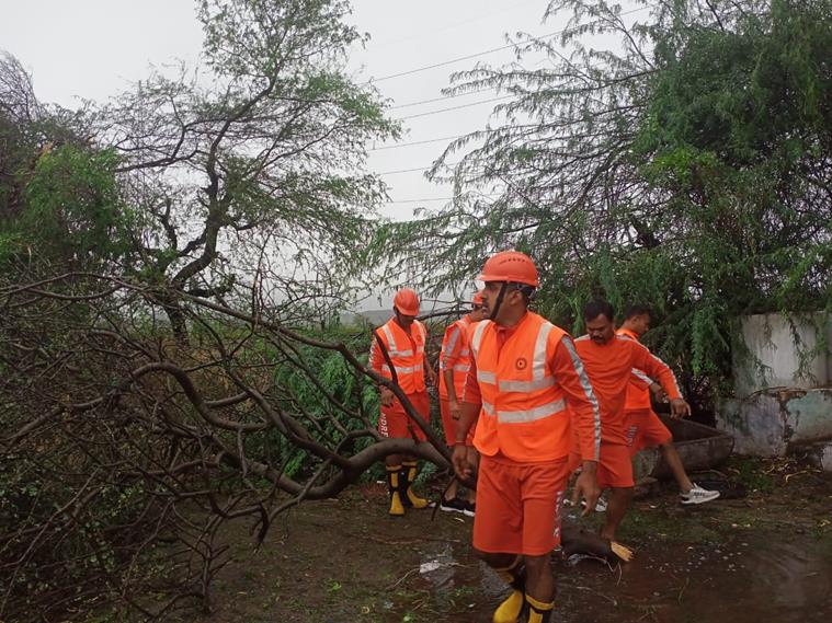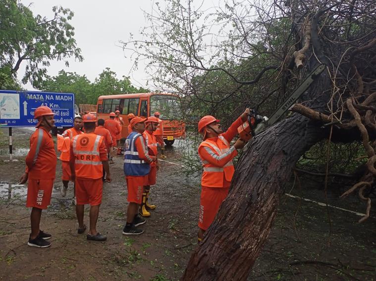 NDRF team cuts down a tree that has fallen, near Rupana harbour village on the road to Rukmani Temple at Devbhumi Dwarka
