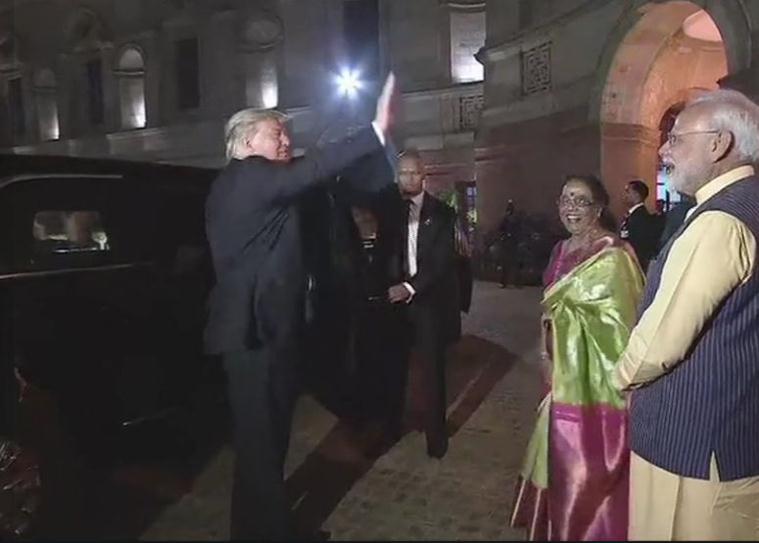 US President Donald Trump and First Lady Melania Trump leave after attending dinner banquet hosted by the President Ram Nath Kovind at Rashtrapati Bhawan. PM Narendra Modi also present.