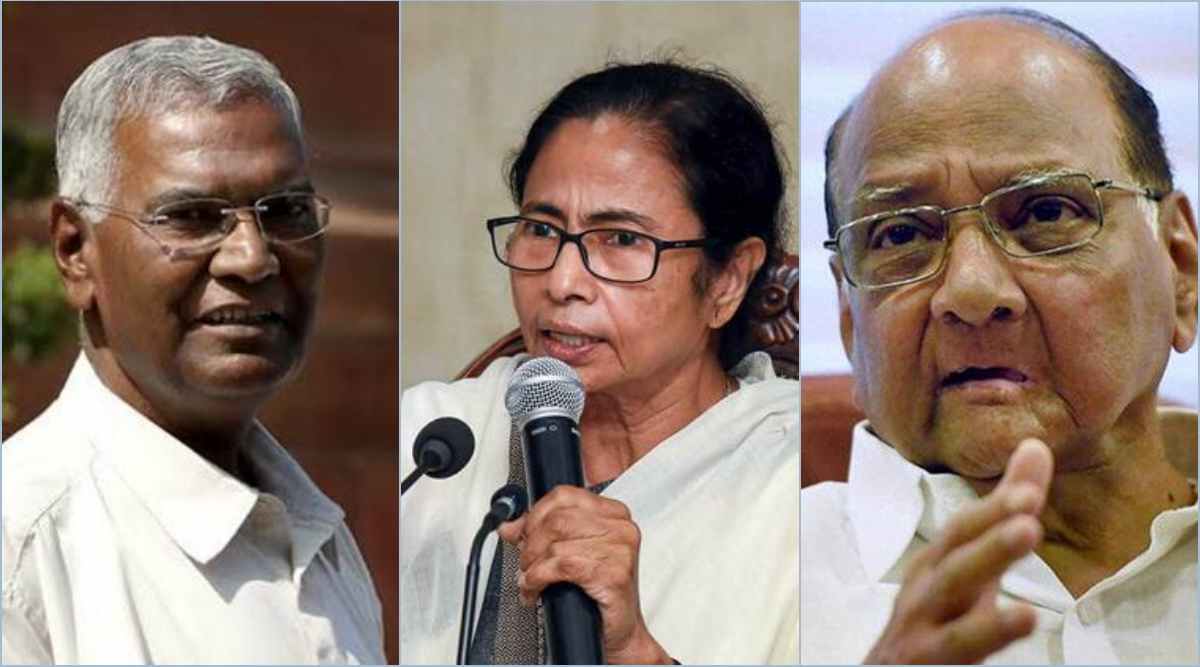 CPI's D Raja; TMC's Mamata Banerjee; NCP's Sharad Pawar.