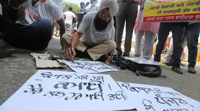 A teacher, Davinder Singh Nagi, makes posters for farmers at along NH-1 in Ludhiana on Friday. (Express photo/Gurmeet Singh)