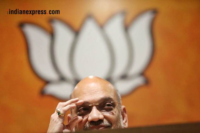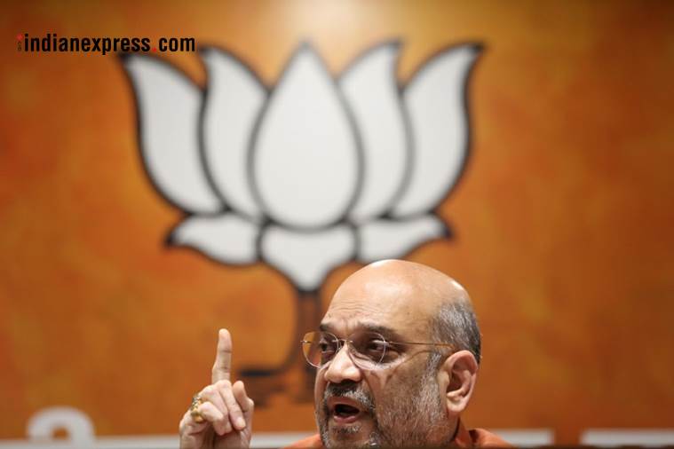 BJP chief Amit Shah at the party headquarters in New Delhi on Saturday. (Express Photo by Tashi Tobgyal)