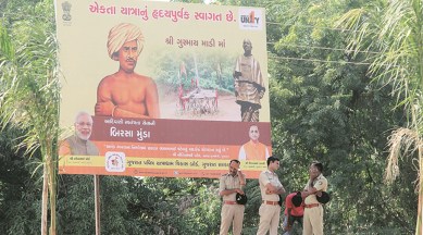 When asked if there was a deliberate decision to replace the torn banners with those having the image of Birsa Munda, Narmada Collector R S Ninama said, “New posters that have been put up were made and sent by the agency in Gandhinagar (Gujarat Tourism). We did not decide it.”
