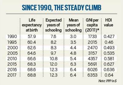 The report states that on an average, people are living longer, are more educated, and have greater income today as is evident in the rise in average HDI levels since 1990 at 22 per cent globally. The least developed countries registered a 51 per cent increase. In keeping with the global trend, in the last 17 years since 1990, India registered a 50 per cent increase.