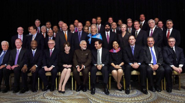 Prime Minister Narendra Modi poses for a group photo with CEOs of America after an interaction, in New York on Thursday. (Source: PTI)