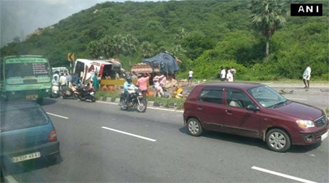 Seventeen people were killed and over 15 injured in a road accident near Krishnagiri on Friday after a truck lost control and collided with a bus on the opposite lane which fell on a car coming close behind. A cargo truck which was coming from Hosur lost control after one of its tyres burst. The truck then hit the median, swerved and collided head-on with a private bus on the opposite lane which was heading towards Hosur from. In the impact, the bus fell partially on the car on one side. [related-post] "Totally, 17 persons were killed including a girl child," Gurbarapalli Police Inspector G Srinivasan said. "Initially, the number of dead persons was six and quickly the toll climbed to seventeen as some of the seriously wounded succumbed to their injuries. All the bodies are in Krishnagiri GH," he told PTI, adding over 15 injured persons were also being treated at the hospital. Condoling the mishap, Chief Minister Jayalalithaa announced a solatium of Rs 1 lakh to each of the dead victims' kin and Rs 50,000 assistance to the grievously injured from the Chief Minister Relief Fund. "I was deeply grieved by the death of 17 persons," she said. "Krishnagiri District Collector and Police Superintendent are on the spot undertaking relief work," Jayalalithaa said in a statement. She said Health Minister Vijayabaskar and Animal Husbandry Minister Balakrishna Reddy have been deputed to ensure best treatment for the injured and also visit the kin of dead in their moment of grief.