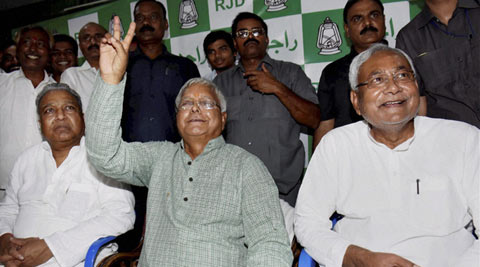 Bihar Chief Minister Nitish Kumar and RJD chief Lalu Prasad after Mahagathbandhan’s (Grand Alliance) victory in Bihar assembly elections at RJD office in Patna on Sunday. (Source: PTI)