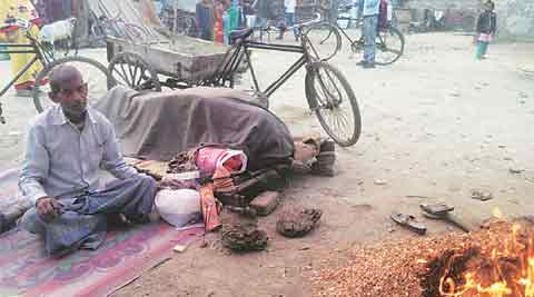 Munni Lal sits next to his wife’s body under a makeshift plastic tent at a JJ cluster in Noida. (Express Photo)