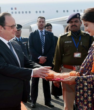 8:10 pm: French President François Hollande being received by Union Min. Prakash Javadekar at Air Force station Palam (Delhi)