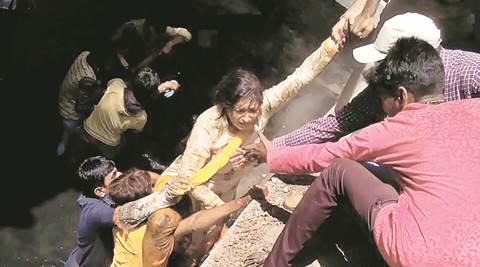 Poonam Maadam being pulled out from drain in Jamnagar on Monday . (Source: Express photo by Vishwas Thakkar)