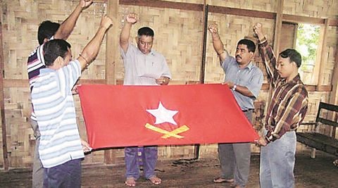 A picture that went viral Wednesday purportedly shows the key leader of the agitation for inner line permits in Manipur taking an oath of allegiance with the flag of a banned insurgent group. There have been reports earlier of the group, United National Liberation Front (UNLF), being behind the inner line permit agitation. Now, the photo is being seen as evidence — it purportedly shows the convener of the Joint Committee for Inner Line Permit (JCILP), Khomdram Ratan, and members of his team taking an oath administered by UNLF organisation secretary Nongyai.