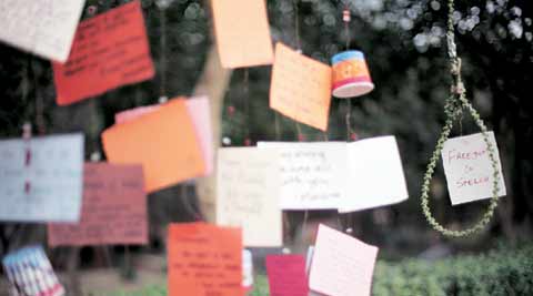 Postcards hung near the JNU Administration block Sunday. (Express Photo: Oinam Anand)