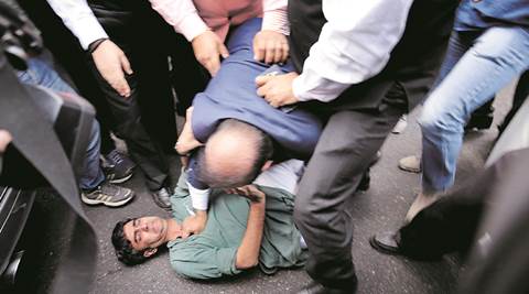 At least ten journalists, including two from The Indian Express, and several students were assaulted Monday by lawyers and a Delhi BJP MLA inside and outside the Patiala House Courts where a sedition case against Jawaharlal Nehru University students’ union president Kanhaiya Kumar was to be heard.