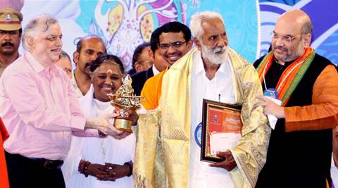 BJP President Chief Amit Shah, Kerala Governor P Sathasivam and Mata Amritanandamayi present Amrita keerthi Puraskar to Mahakavi Muthukulam Sreedharanat an event in Kollam on Sunday. (Source: PTI)