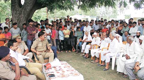 Village pradhan, circle officer and subdivisional magistrate address a peace meeting at Kadali village, in Muzaffarnagar on Monday. (Source: Express photo by Gajendra Yadav)