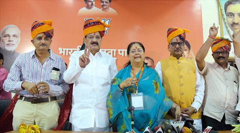Rajasthan Chief Minister Vasundhara Raje, accompanied by party candidates M. Venakaiah Naidu and Om Mathur, Ramkumar Verma, Harshvardhan singh Dungarpur after their victory in Rajya Sabha elections in Jaipur on Saturday. (Source: PTI Photo)