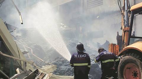 Fire brigade personnel control the blaze at the cotton recycling godown in Nanekarwadi near Chakan, Thursday. (Express Photo by Rajesh Stephen)