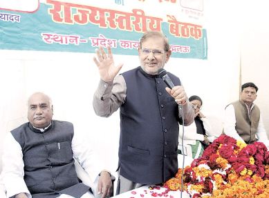 JD (U ) chief Sharad Yadav at a meeting at the state party office in Lucknow Sunday. (Express Photo by Pramod Adhikari)