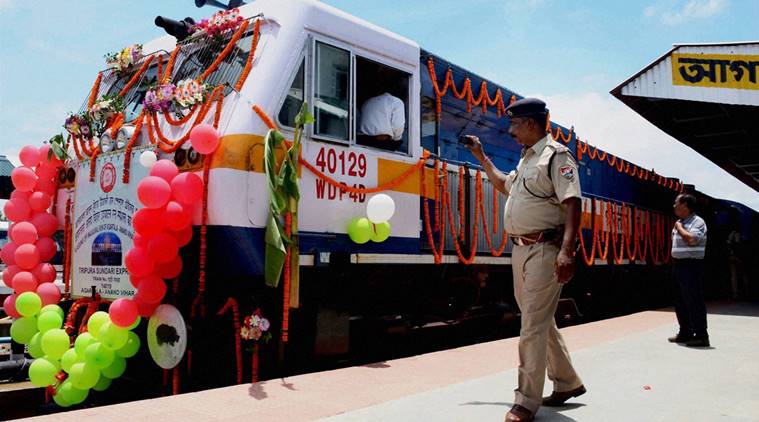 Tripura entered the broad gauge railway map of the country on Sunday with Union Railway Minister Suresh Prabhu flagging off the Agartala-New Delhi ‘Tripura Sundari Express’. The foundation stone for the much awaited railway track to link Agartala to Akhoura in Bangladesh was jointly laid at the programme by Prabhu and his Bangladeshi counterpart Md Mujibul Haque.’Tripura Sundari Express’ will run once a week on Sundays and will reach New Delhi in 47 hours after travelling via Guwahati-New Jalpaiguri. Rs 968 crore was spent for Agartala-Delhi rail link.