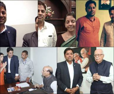 The cover photo of the page shows Vikram leaning on a sofa chair on which Union Home Minister Rajnath Singh is seated. The profile photo is him with veteran BJP leader LK Advani.