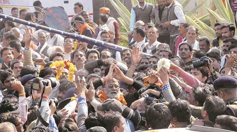 Laxmikant Sharma outside the jail in Bhopal after being released on bail, Sunday. (Source: Express)