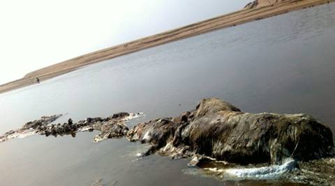 The carcass of a whale was found near Mangala river mouth in Puri on Tuesday morning. (Express photo by Debabrata Mohanty)