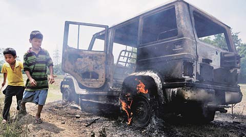 Children play near a vehicle torched in Imphal, Thursday. (Source: PTI)Eight cadre members of the Kuki Revolutionary Front (KRF), a banned underground group in Manipur and a Suspension of Operation signatory with the Indian government, were picked up on Wednesday by a joint team of the Imphal West and Imphal East police commandos for the murder of two masons after a search operation was conducted in Thingsat village and its surrounding areas.
