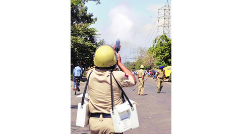 A police personnel fires teargas to disperse protesting residents in Industrial Area on Saturday. (Source: Express Photo by Sahil Walia)