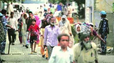 The district administration had cleared the way for the return by removing burnt vehicles that had blocked the road, fishing out bricks from the drain and reconnecting gas pipelines that were severed during the riots.