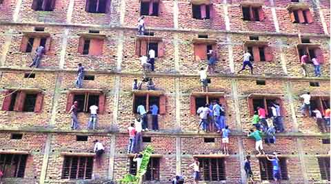 The photograph of men scaling the exam centre wall, which went viral, forcing the Bihar government to act tough against cheating. (Source: Express Photo by Prashant Ravi)