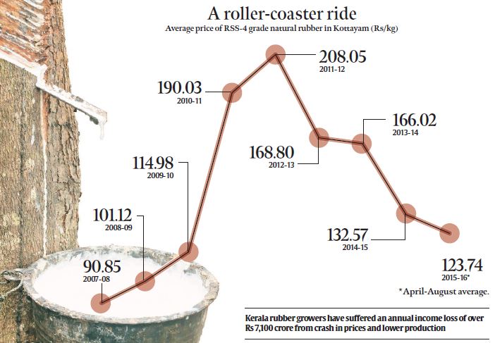Kerala has an estimated 11.50 lakh rubber growers, the major chunk of them small and marginal holders with less than two hectares. Until two years back, the state’s annual production had been roughly 8,00,000 tonnes out of India’s total 9,00,000 tonnes. But production fell to 7,74,000 tonnes in 2013-14 and even further to 6,55,000 tonnes last fiscal, as growers kept away from tapping due to low returns. Taking into account an average price fall from Rs 208.05 to Rs 132.57 per kg between 2011-12 and 2014-15, along with a production decline from 7,98,940 to 6,55,000 tonnes, Kerala rubbers would have suffered an annual income loss of over Rs 7,100 crore during this period.