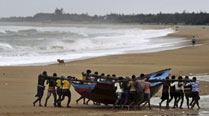 Fishermen move a boat away from the coast following cyclone Hudhud warning near Podampeta village in Ganjam district on Saturday. (Source: PTI)