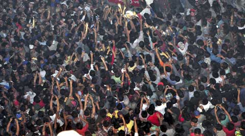 In this Thursday, March 5, 2015 photo, members of a mob raise their hands to take photos of a man, top center, accused of rape after he was lynched and hung in the city landmark Clock Tower in Dimapur, in the northeastern Indian state of Nagaland. (Source: AP) In this Thursday, March 5, 2015 photo, members of a mob raise their hands to take photos of a man, top center, accused of rape after he was lynched and hung in the city landmark Clock Tower in Dimapur, in the northeastern Indian state of Nagaland. (Source: AP)