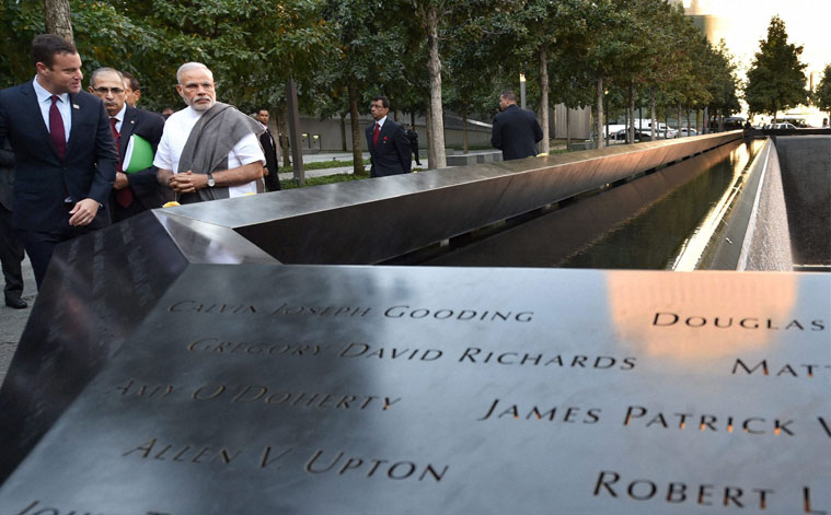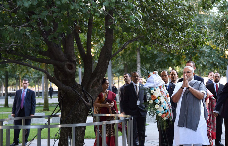 Modi began second day of his packed US visit at Ground Zero in lower Manhattan, where the two towers of the World Trade Center were destroyed in 2001 and where the memorial was opened in May this year.